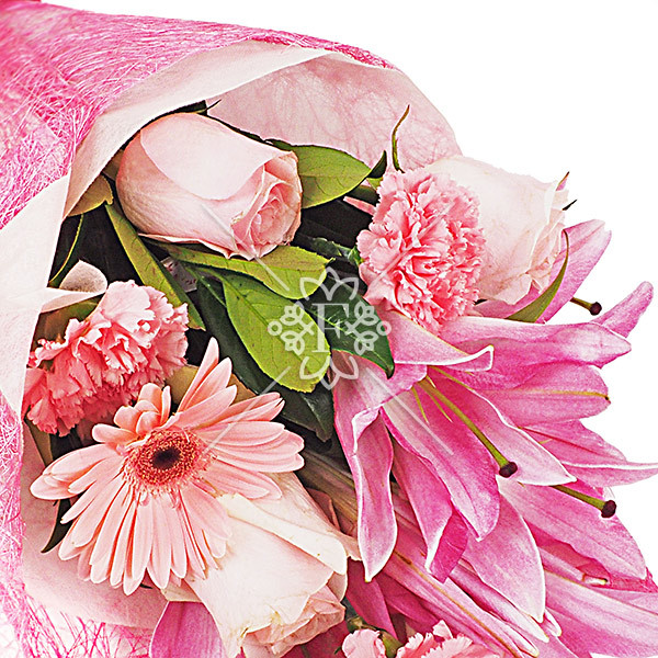 лилия розовая - 1 шт, гербера розовая - 2 шт, роза розовая - 2 шт, гвоздика розовая - 2 шт, упаковка, бант розовый.