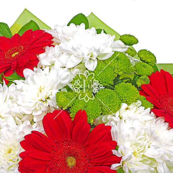 Белоснежно-воздушные хризантемы придают цветочной композиции легкость и невесомость, их прекрасно дополняют необыкновенные и привлекательные хризантемы зеленого цвета, а яркими акцентами выступают чудесные алые герберы!