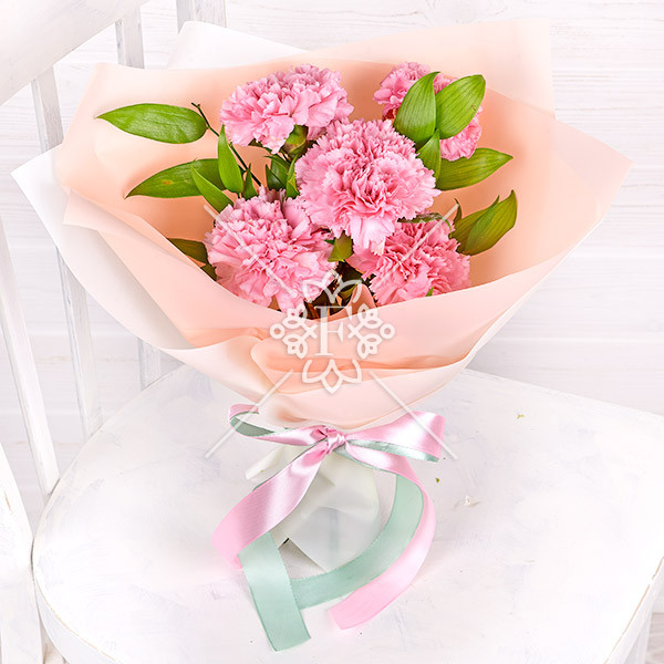 Гвоздика розовая– 5 шт., рускус – 1 шт., упаковка, лента.