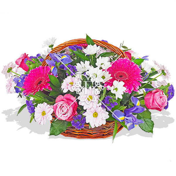 Пушистые шапочки хризантем наполняют корзину желаемым цветочным объемом, а розовые розы и герберы  придают корзине аккуратную нежность. Ирисы и  статица, которые будто только что сорваны с в прекрасном саду, дополняют композицию.