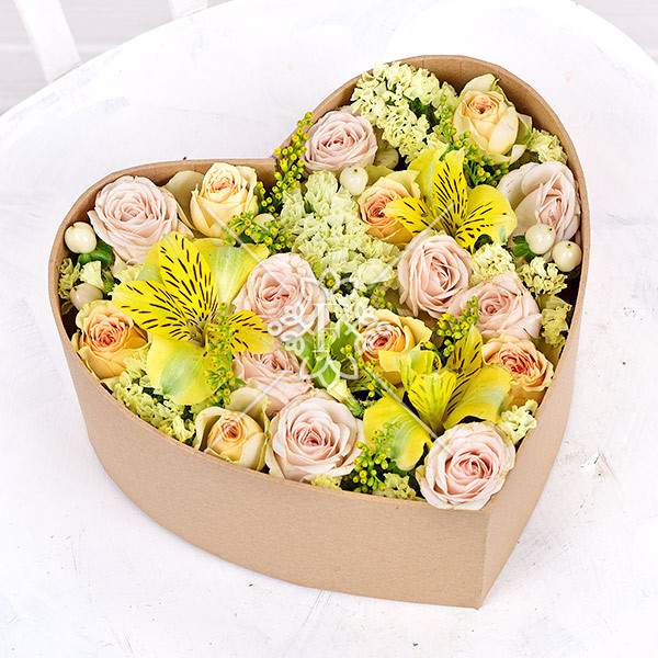 роза кремовая кустовая – 2 шт., роза желтая кустовая – 2 шт., альстромерия желтая - 1 шт., гиперикум белый – 1 шт., статица жёлтая – 1 шт., зелень декоративная (солидаго), оазис, коробка.